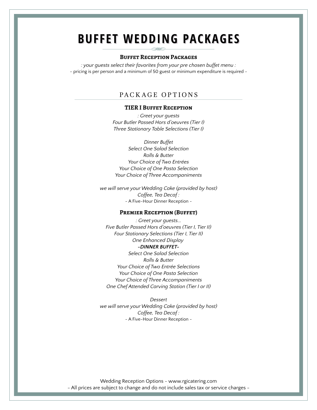 Because buffet-style is more of an informal wedding catering style it may not suit your wedding or venue aesthetic. For additional Buffet Entrée selections please see the Seated-Served Wedding Reception Dinner Menu. This differs from a station-style reception which will feature multiple menu concepts scattered at multiple.