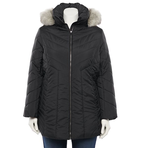 Plus Size Tower By London Fog Faux Fur Trim Hooded Puffer Jacket